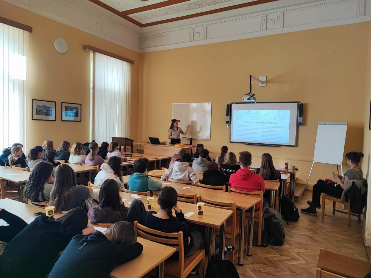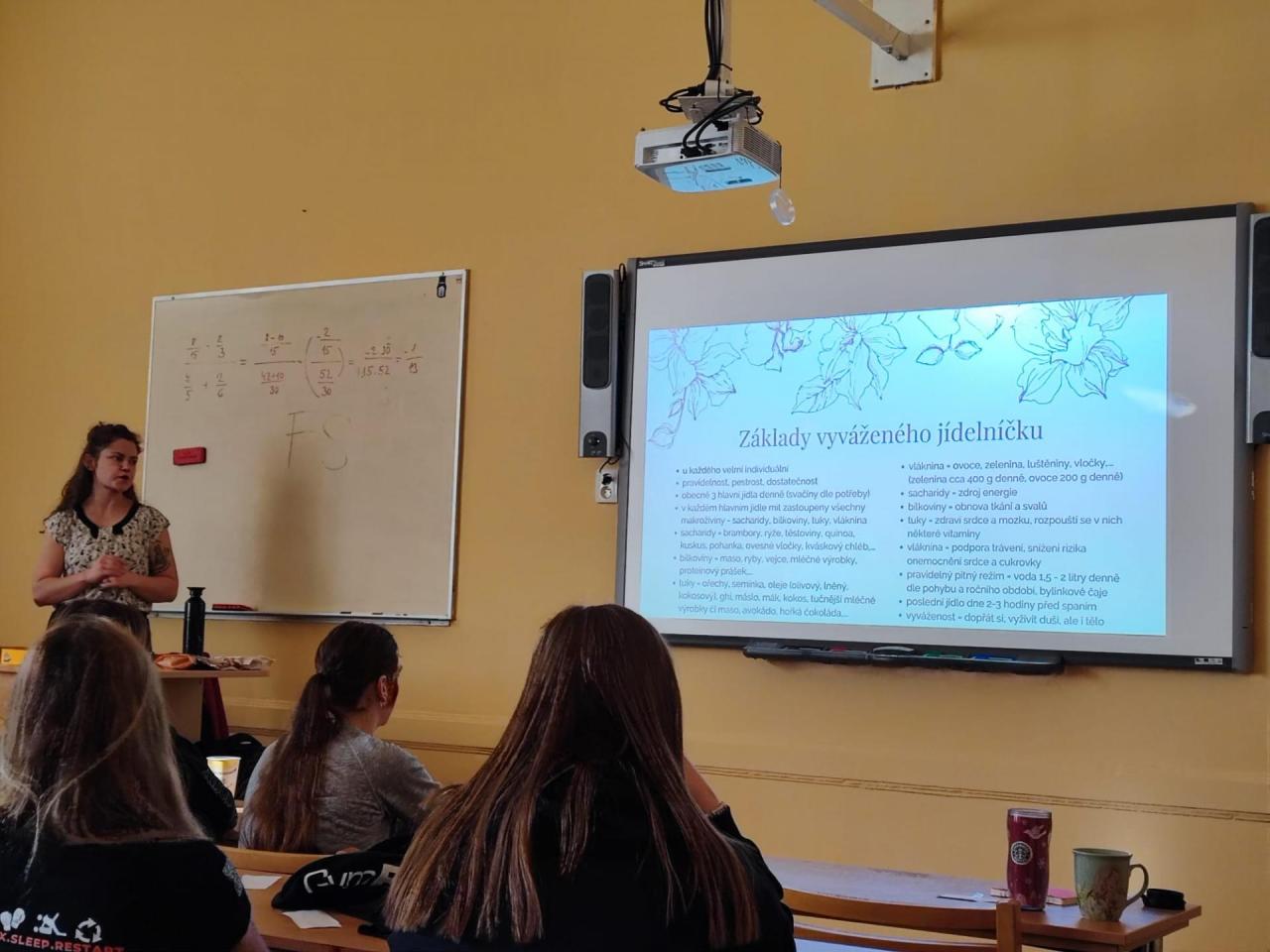 O mýtech ve výživě, o principech vyváženého jídelníčku a o tom, jak vše souvisí se vztahem k sobě, přišla žákům 1. ročníku 16. října. přednášet nutriční mentorka Lucie Vondrýsková. Hovořila o tom, jakou roli v této oblasti může hrát stres, společenský tlak na pomyslný ideál krásy nebo sociální sítě. Žáci si vyzkoušeli všímavé jedení. Prostor byl dán i jejich otázkám.