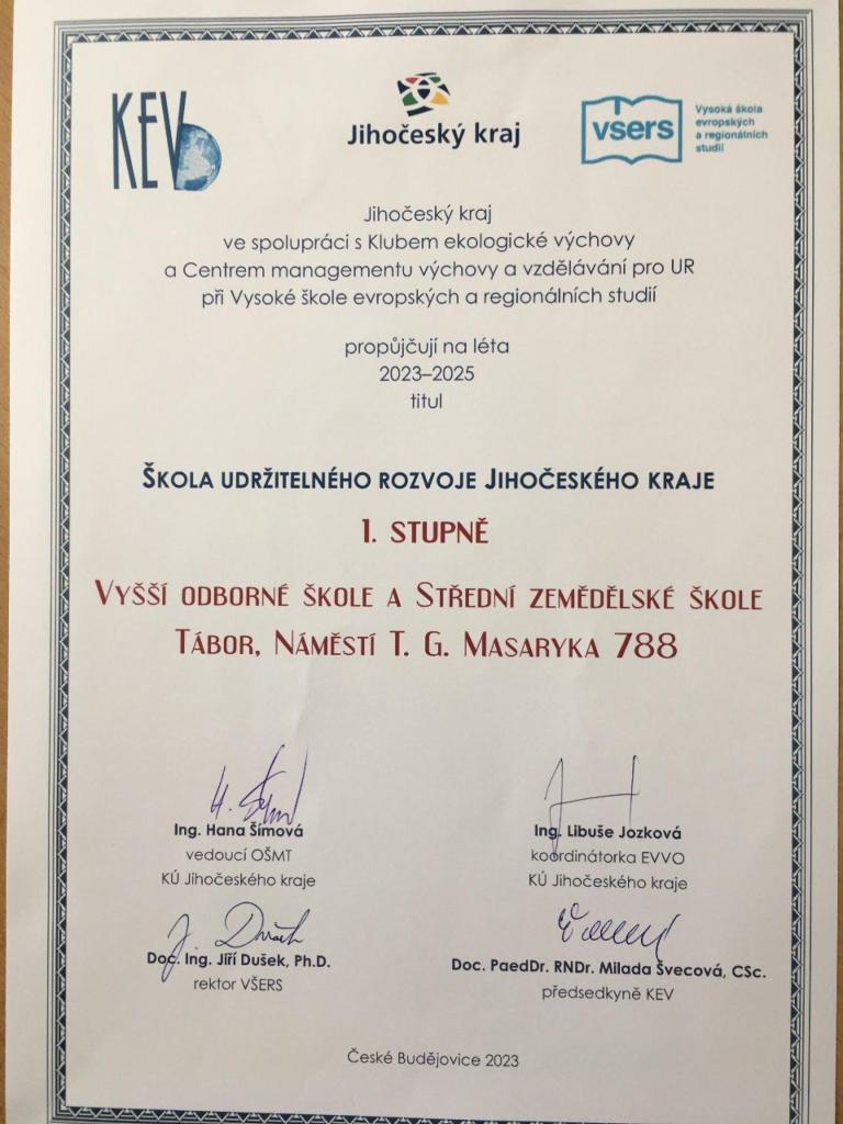 Jihočeský kraj ve spolupráci s Klubem ekologické výchovy a Centrem managementu výchovy a vzdělávání pro UR při Vysoké škole evropských a regionálních studií naší škole propůjčil na léta 2023-2025 titul ŠKOLA UDRŽITELNÉHO ROZVOJE JIHOČEKÉHO KRAJE 1. STUPNĚ.